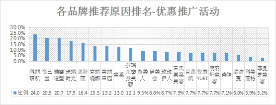 排名第一的是科麗研肌,優(yōu)惠推廣活動推薦率為24.0%;其次是悅己堂,推薦率為20.9%;第三名是雅望造型,推薦率為20.7%。