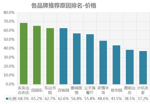 排名第一的是友友山谷農(nóng)莊,價格推薦率為68.5%;其次是田園樂,推薦率為65.2%;第三名是東山書院,推薦率為62.7% 。