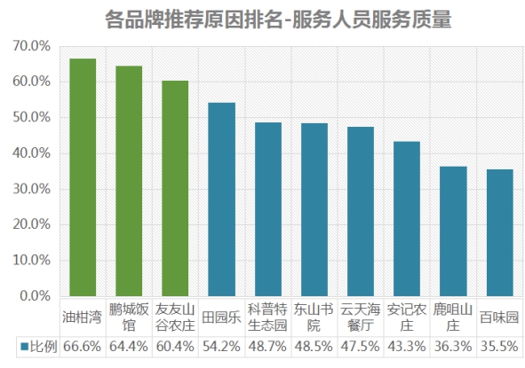 排名第一的是油柑灣,服務(wù)人員服務(wù)質(zhì)量推薦率為66.6%;其次是鵬城飯館,推薦率為64.4%;第三名是友友山谷農(nóng)莊,推薦率為60.4% 。