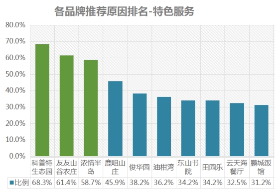 排名第一的是科普特生態(tài)園,特色服務(wù)推薦率為68.3%;其次是友友山谷農(nóng)莊,推薦率為61.4%;第三名是濃情半島,推薦率為58.7% 。