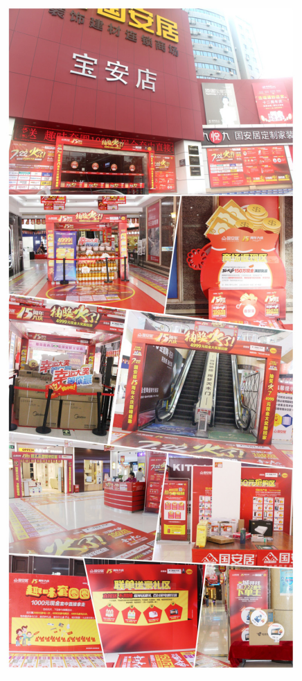 如今,國安居15周年大慶的消息已傳遍鵬鵝兩城。11重優(yōu)惠成為眾多裝修業(yè)主的福音,目前,各分店全部張燈結(jié)彩煥然一新,高掛巨幅折扣牌,各環(huán)節(jié)的獎品堆積如山,戶外廣告鋪天蓋地,有圖有真相。