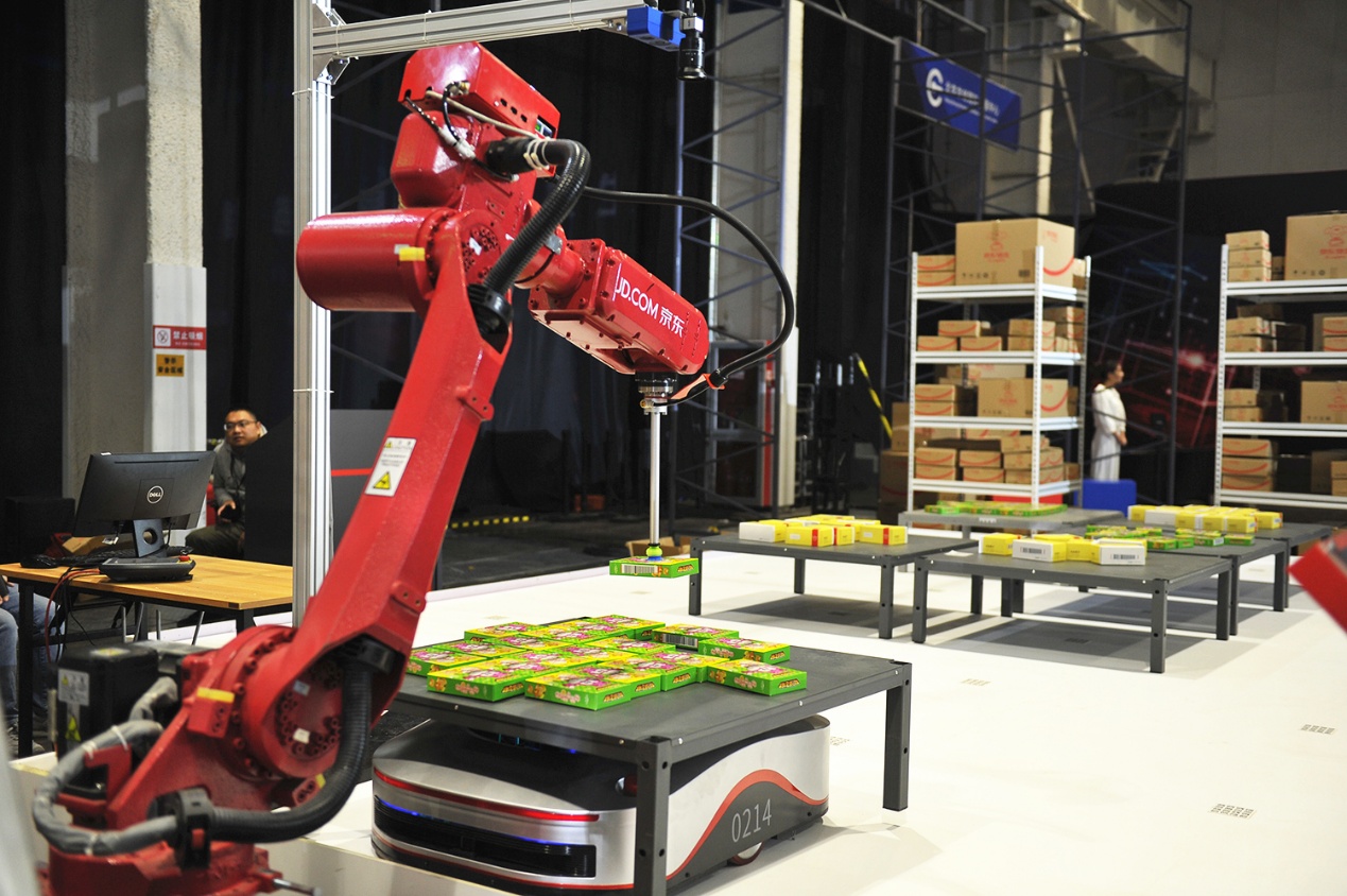 為了展現(xiàn)無(wú)人倉(cāng)的全程智能化流程,本次峰會(huì)外展區(qū)設(shè)置了智能動(dòng)態(tài)展區(qū)。在現(xiàn)場(chǎng),動(dòng)態(tài)運(yùn)行的揀選機(jī)械臂、自動(dòng)打包機(jī)與飛馬機(jī)器人、智能叉車(chē)等一起,共同構(gòu)成了京東無(wú)人倉(cāng)強(qiáng)大的倉(cāng)儲(chǔ)系統(tǒng)。目前在京東智能化倉(cāng)儲(chǔ)體系內(nèi),智能機(jī)器人設(shè)備已經(jīng)實(shí)現(xiàn)了家用電器、美妝個(gè)護(hù)、電腦辦公、服飾內(nèi)衣、醫(yī)療保健等五大訂單品類(lèi)的應(yīng)用場(chǎng)景覆蓋,通過(guò)地狼、天狼、分揀AGV、交叉帶分揀機(jī)、AGV叉車(chē)、機(jī)械臂等12種自主研發(fā)機(jī)器人的投用,大大提升了京東的訂單處理效率。