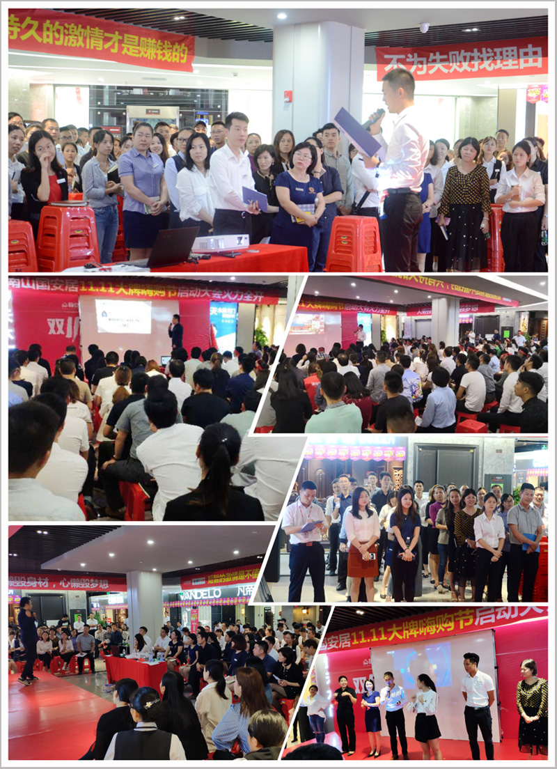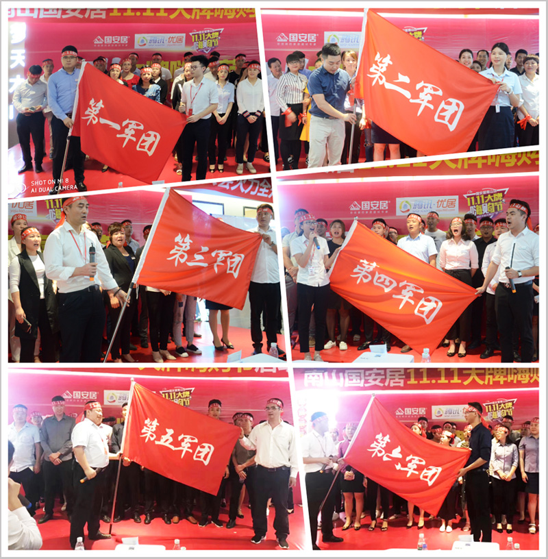 隨后,來(lái)自南山店全體方陣隊(duì)員高舉隊(duì)旗,高喊口號(hào),將現(xiàn)場(chǎng)氣氛推向高潮,品牌代表們紛紛上臺(tái)發(fā)言,幾百家建材家具品牌以第一軍團(tuán)、第二軍團(tuán)、第三軍團(tuán)、第四軍團(tuán)、等等團(tuán)隊(duì)方陣,登場(chǎng)亮相,高呼團(tuán)隊(duì)口號(hào),并且當(dāng)場(chǎng)簽署了“雙11大促”的軍令狀,并從商場(chǎng)負(fù)責(zé)人手中接過(guò)了“雙11大促”的軍旗,這將預(yù)示著“國(guó)安居南山店&騰訊優(yōu)居雙11大牌嗨購(gòu)節(jié)”定將以卓越的佳績(jī),創(chuàng)造新一輪的銷售盛況!
