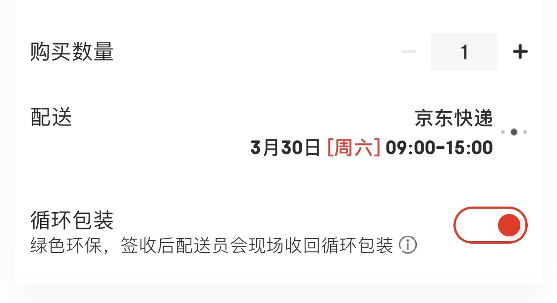當(dāng)下單頁面出現(xiàn)“循環(huán)包裝”的選擇項時,就說明該商品支持青流箱配送。只要用戶進行選擇,即可參與到環(huán)保行動中,減少一次性包裝使用,以點滴行為助力綠色可持續(xù)發(fā)展事業(yè)!目前,該活動涉及的商品種類數(shù)量達(dá)數(shù)萬個,涵蓋美妝、食品、手機、網(wǎng)絡(luò)配件、數(shù)碼配件、辦公用品等。