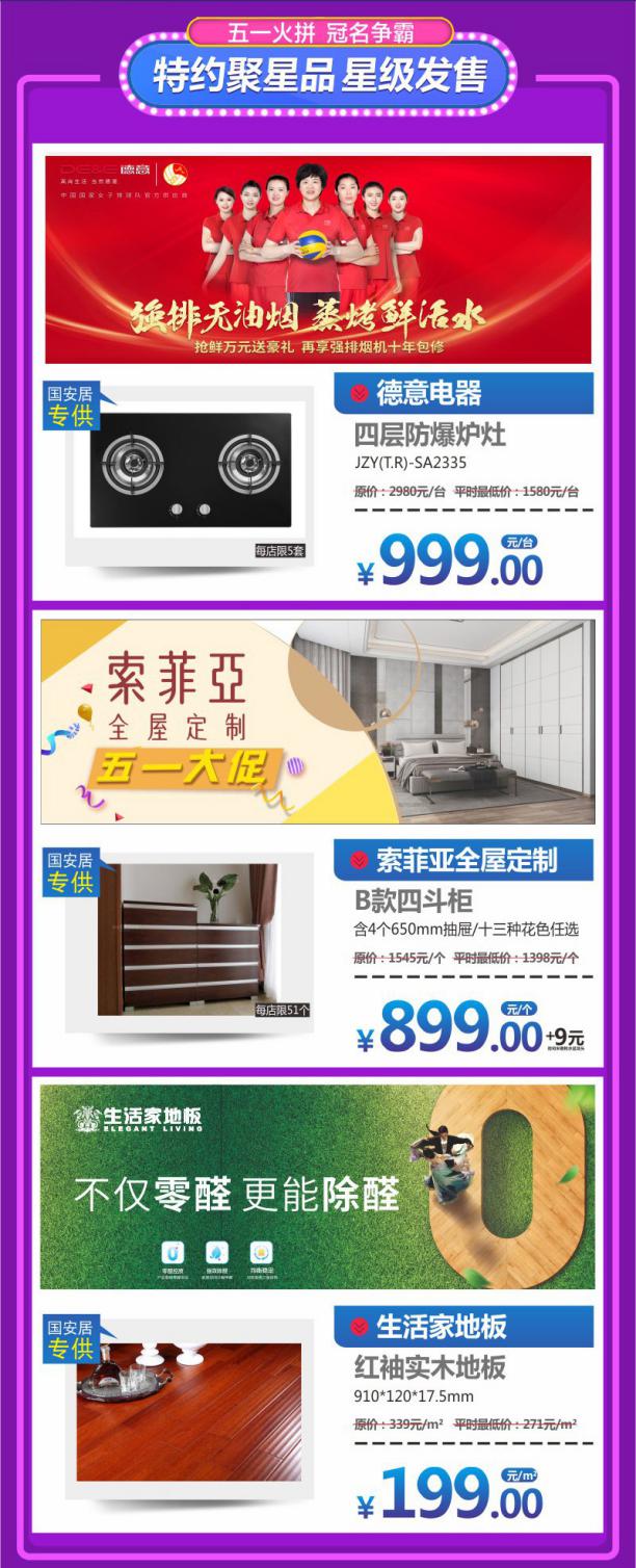 4、冠名聚星品爆款星級(jí)發(fā)售:4月20日-5月4日活動(dòng)期間,國(guó)安居精選三大家居大牌火拼五一,星級(jí)巨獻(xiàn)!999元搶德意電器爐灶、899元搶索菲亞全屋定制四斗柜、199元搶生活家實(shí)木地板,限量爆款全城瘋搶,絕對(duì)驚爆眼球。