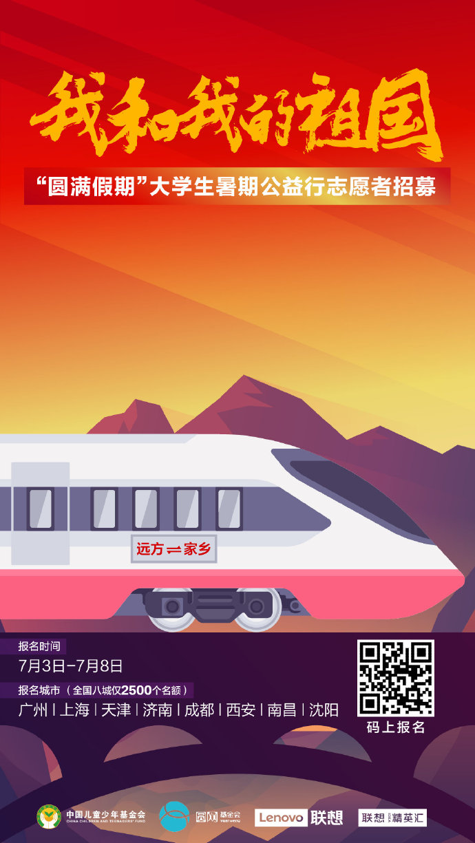 7月3日,由中國兒童少年基金會、北京圓網(wǎng)慈善基金會和聯(lián)想集團(tuán)共同發(fā)起的“‘我和我的祖國’圓計劃—圓滿假期大學(xué)生暑期公益行”活動,面向全國8個城市的大學(xué)生正式開啟志愿者招募,邀請回鄉(xiāng)大學(xué)生加入到為廣大留守兒童群體量身定制的公益行動中,幫孩子團(tuán)圓、為孩子圓夢、讓愛心圓滿。對于大學(xué)生來說,這將是一次獨特的公益實踐經(jīng)歷。
