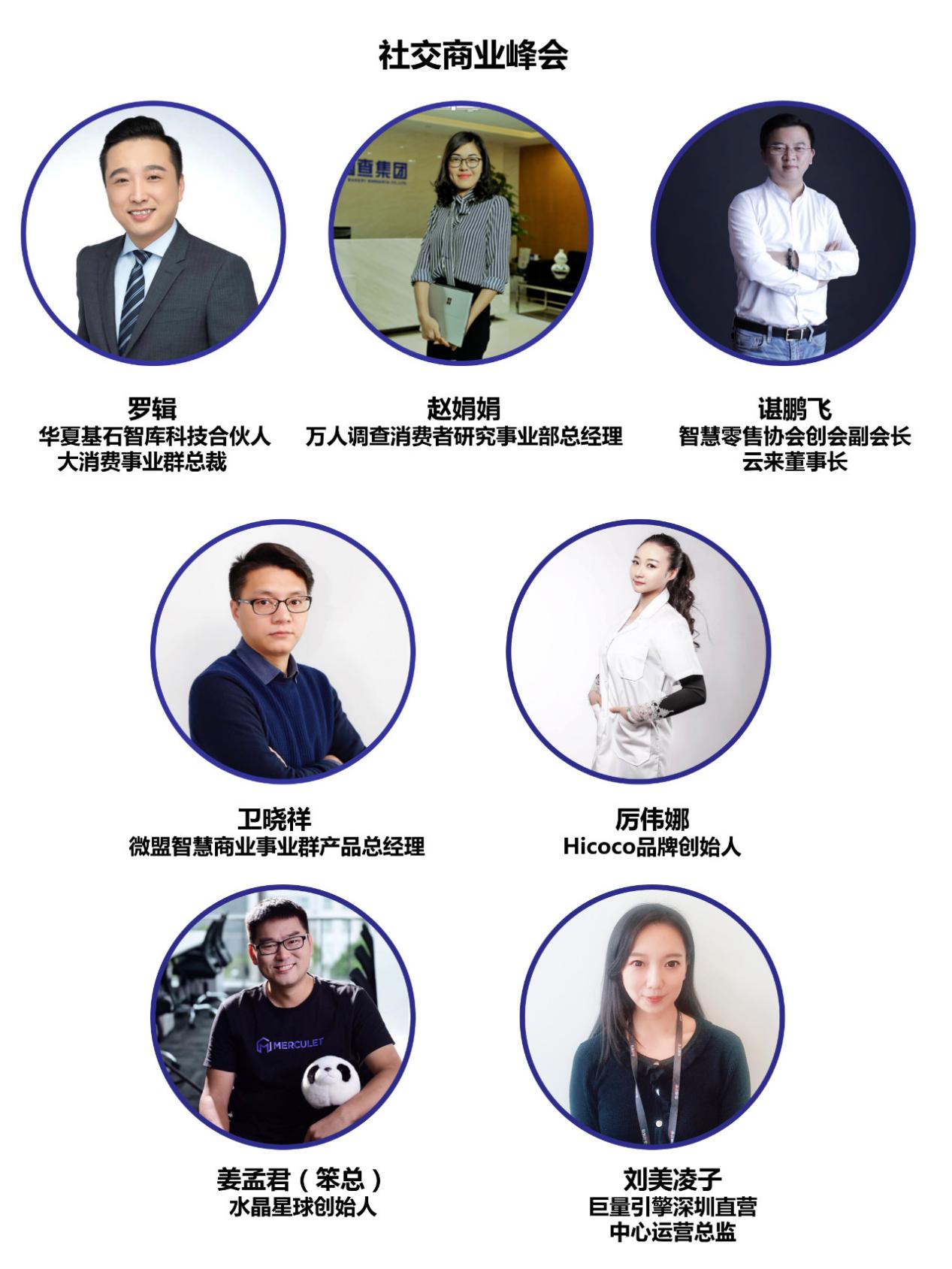10月30日14:00—17:00(宴會(huì)廳Ⅲ)舉行社交電商峰會(huì),華夏基石智庫(kù)科技合伙人、大消費(fèi)事業(yè)群總裁羅 輯主持峰會(huì)。萬(wàn)人調(diào)查消費(fèi)者研究事業(yè)部總經(jīng)理趙娟娟演講主題《2019年深圳市消費(fèi)者線上線下渠道消費(fèi)洞察》,智慧零售協(xié)會(huì)創(chuàng)會(huì)副會(huì)長(zhǎng)、特聘專(zhuān)家;云來(lái)董事長(zhǎng)諶鵬飛演講主題《私域流量社交商業(yè)模式解碼》,微盟智慧商業(yè)事業(yè)群產(chǎn)品總經(jīng)理衛(wèi)曉祥演講主題《企業(yè)布局社交電商的四種模式》,Hicoco品牌創(chuàng)始人厲偉娜演講主題《說(shuō)說(shuō)美業(yè)那些事》,水晶星球創(chuàng)始人姜孟君演講主題《社群時(shí)代的影響力和業(yè)績(jī)?cè)鲩L(zhǎng)》,巨量引擎深圳直營(yíng)中心運(yùn)營(yíng)總監(jiān)劉美凌子演講主題《D造營(yíng)銷(xiāo)新零售助力品牌升級(jí)布局》