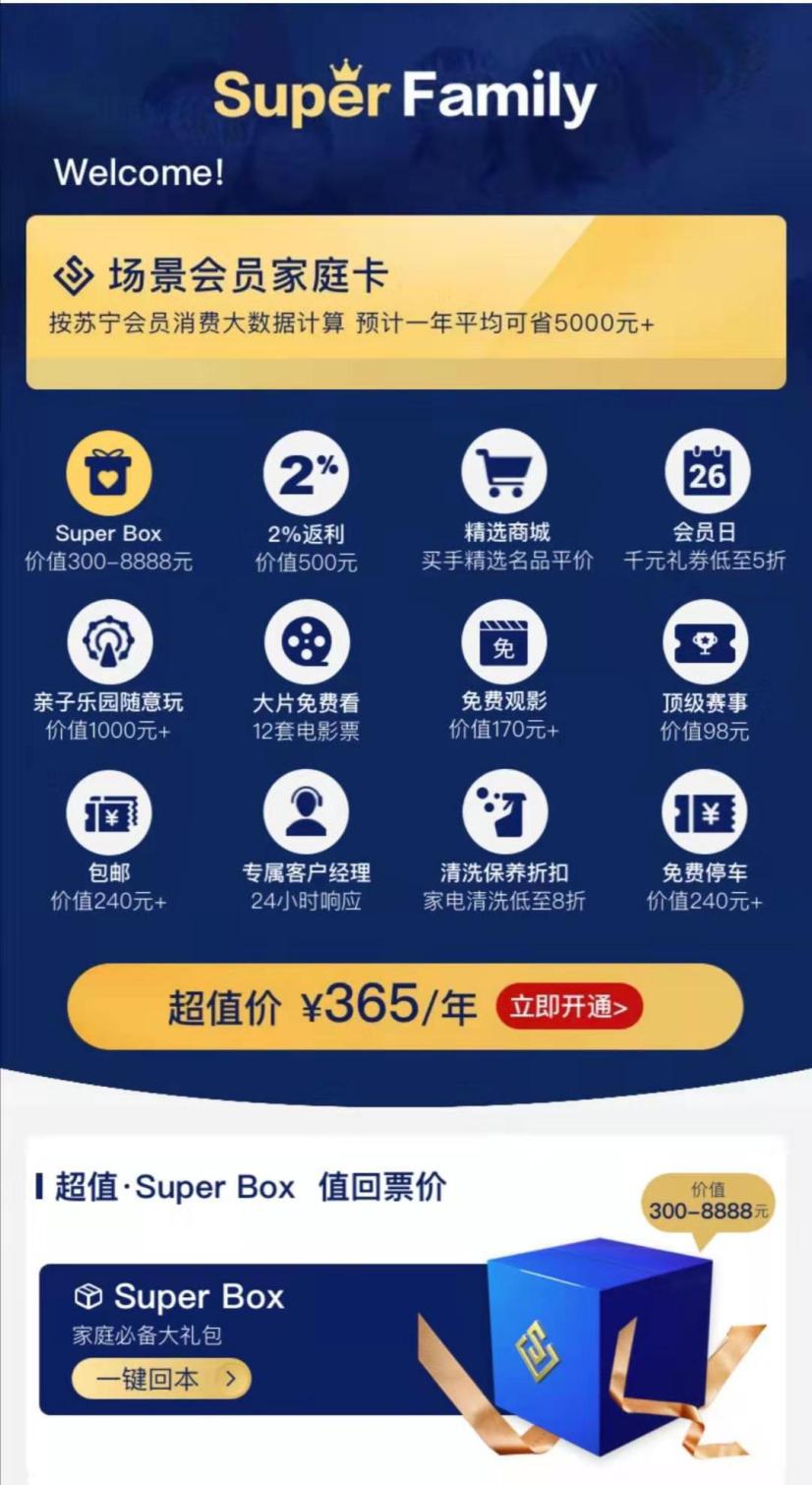 Super Family是一款基于“家”概念打造的場(chǎng)景會(huì)員。調(diào)集了蘇寧全場(chǎng)景服務(wù)能力,滿(mǎn)足不同家庭成員需求。比如備受關(guān)注的實(shí)物盲盒Super Box,有四個(gè)系列供用戶(hù)選擇:滿(mǎn)足家庭清潔的貼心系列、滿(mǎn)足家人味蕾的星廚系列、滿(mǎn)足健康需求的活力系列和滿(mǎn)足家居需求的美家系列。