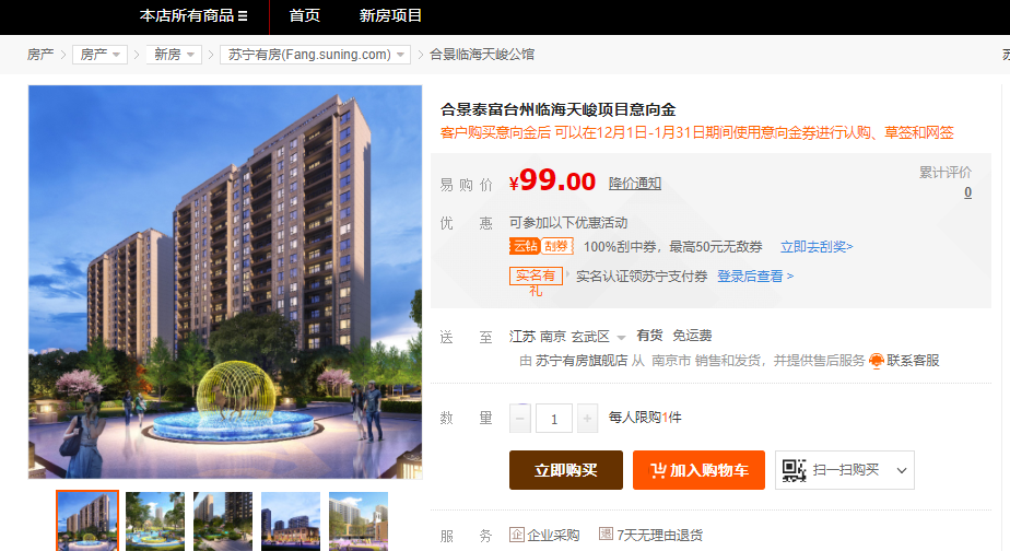 購(gòu)房者在蘇寧易購(gòu)首頁(yè)進(jìn)入“新房特惠”專題,選擇意向房源,購(gòu)買(mǎi)99元意向金之后,可優(yōu)先購(gòu)買(mǎi)雙十二特價(jià)房。