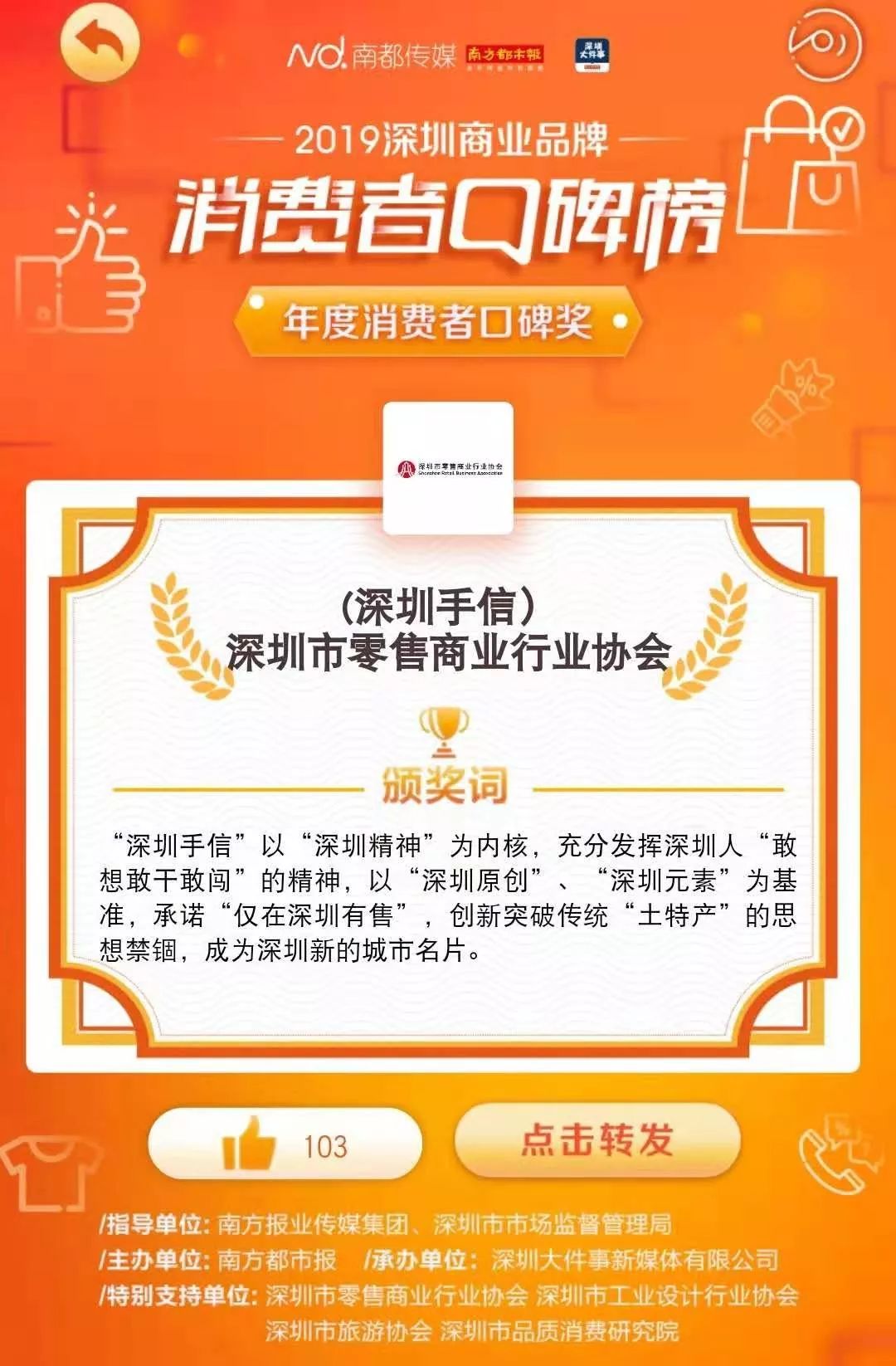 深圳手信作為深圳的城市品牌順利斬獲2019年“深圳商業(yè)品牌·消費(fèi)者口碑榜”【年度口碑大獎(jiǎng)】。作為城市之禮,“深圳手信強(qiáng)調(diào)“深圳精神”創(chuàng)新內(nèi)核,臻選一城好禮,所有產(chǎn)品來(lái)自深圳本土優(yōu)秀企業(yè)。