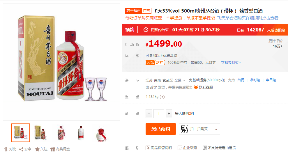 買(mǎi)年貨上蘇寧,買(mǎi)好酒上蘇寧。要說(shuō)年貨節(jié)期間,蘇寧超市酒水類目的明星產(chǎn)品,還要屬1499元的飛天茅臺(tái)酒。年貨節(jié)期間,蘇寧已經(jīng)啟動(dòng)了多輪的飛天茅臺(tái)酒的預(yù)約搶購(gòu),而1月10日即將迎來(lái)新一輪的搶購(gòu)。截至1月8日上午10點(diǎn)多,已經(jīng)有超過(guò)14萬(wàn)實(shí)名認(rèn)證super會(huì)員參與了本次預(yù)約。