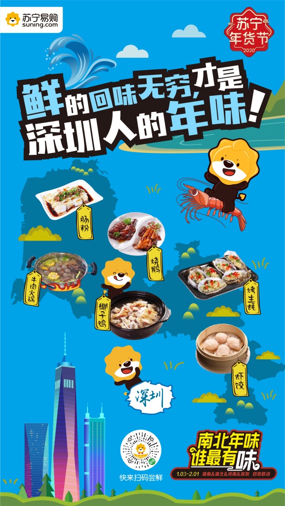 說起年味必提到年夜飯,中國地大物博每個(gè)城市的年夜飯各有特色,究竟哪個(gè)城市的年味最濃,各家眾說紛紜。為此華南、華中、華北具有代表性的四個(gè)城市紛紛站出來為各家城市的年味代言,深圳、武漢、長沙、鄭州四城分別從年味、年俗、年貨、方言等方方面面為消費(fèi)者獻(xiàn)上了一頓年味大餐。那些記憶里存在的各色過年儀式,味覺里保留的故鄉(xiāng)味道,腦海里熟悉的地方鄉(xiāng)音,在這場年味比拼里一一重現(xiàn),喚醒了大家對于過年的期許,引發(fā)社交平臺(tái)上大家對于年味的分享。對于深圳這個(gè)移民大城往往被貼上沒有特色年貨的標(biāo)簽,其實(shí)不然,作為嶺南文化重要傳承地的深圳擁有眾多特色年俗。并且隨著越來越多的人選擇春節(jié)留在深圳過年,深圳的年味也越來越濃,因此深圳蘇寧在本次南北年味的話題中,不斷深挖深圳年味,打造了一張?zhí)厣某鞘写汗?jié)名片。
