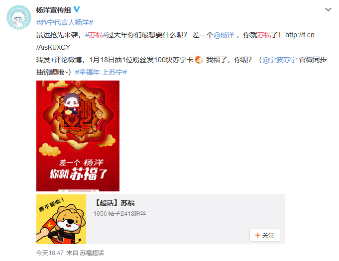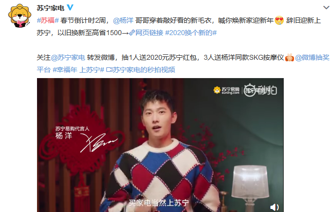 蘇寧代言人楊洋和江疏影也給大家?guī)砹瞬簧俑@?,粉絲們繼續(xù)喊話愛豆,“過年就差一個(gè)楊洋了,萬一實(shí)現(xiàn)了呢”。蘇寧家電直接開啟鼠運(yùn)來襲模式,粉絲參與微博互動(dòng),就有機(jī)會(huì)獲得2020元蘇寧紅包,還能獲得楊洋同款SKG按摩儀。