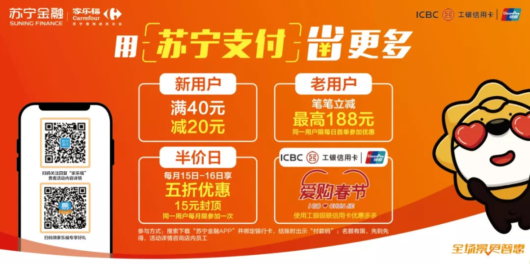 注意啦!使用蘇寧支付省更多!下載“蘇寧金融APP”并綁定銀行卡,在家樂(lè)福門(mén)店結(jié)賬時(shí)出示“付款碼”,新用戶(hù)可享滿(mǎn)40元減20元,老用戶(hù)筆筆立減,最高188元。每月15日至16日半價(jià)日,蘇寧支付用戶(hù)還可享五折優(yōu)惠,15元封頂。名額有限,先到先得。