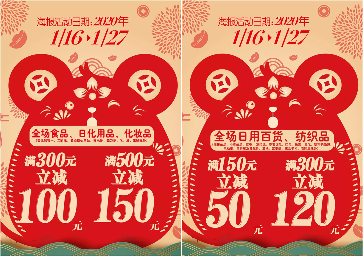 1月16日至1月27日,家樂(lè)福華南區(qū)全場(chǎng)食品、日化用品、化妝品滿(mǎn)300元立減100元,滿(mǎn)500元立減150元;全場(chǎng)日用百貨、紡織品(除家電)滿(mǎn)150元立減50元。細(xì)則請(qǐng)見(jiàn)家樂(lè)福店內(nèi)信息板或洽詢(xún)工作人員。