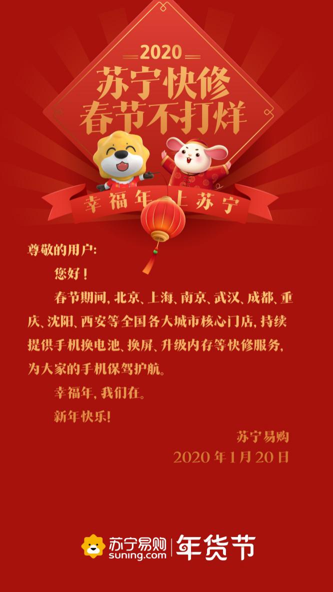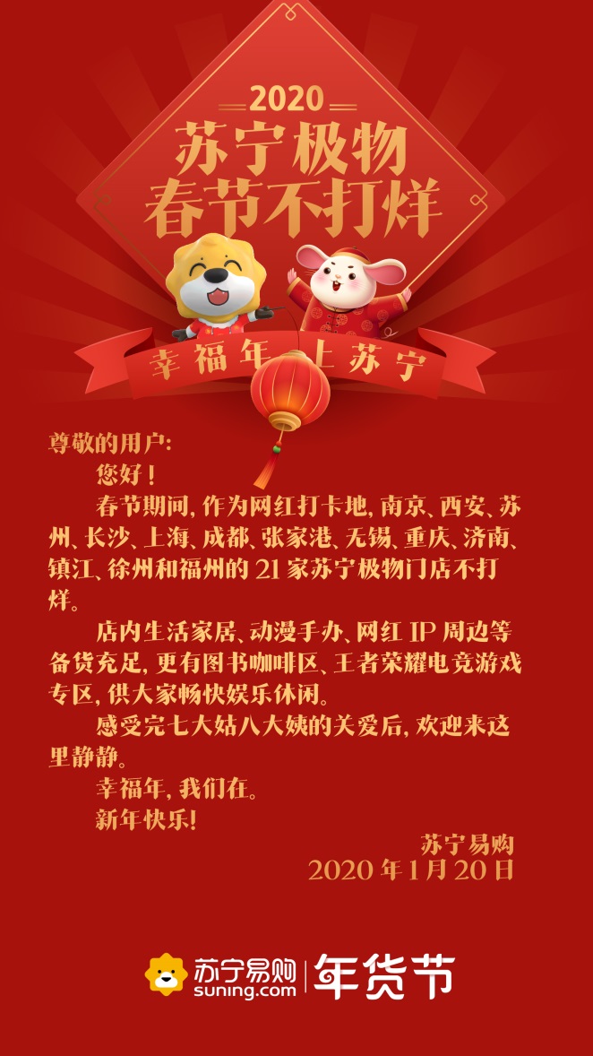 深圳新聞網(wǎng)2020年1月21日訊 春節(jié)臨近,忙著打烊成為了商家常態(tài)。有意思的是,1月20日,蘇寧連發(fā)9條通知,廣而告之“不打烊”。通知顯示,物流、蘇寧幫客、蘇寧快修、以舊換新等服務(wù)內(nèi)容,電器店、家樂福、零售云、紅孩子門店、極物等線下業(yè)態(tài)都確保不打烊、不漲價。