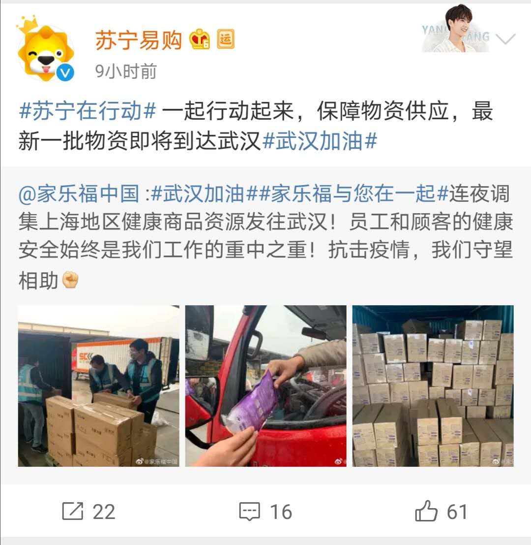 在疫情后方,不少后勤保障單位、組織也是做好了充足的準(zhǔn)備。1月23日,蘇寧旗下家樂福中國官方微博發(fā)布了一條關(guān)于 #家樂福堅(jiān)決不漲價,虧錢也不能漲!#的微博表示,家樂福中國管理團(tuán)隊(duì)承諾春節(jié)期間民生用品不漲價,同時針對武漢及全國范圍都提前備好充足貨量,誓與全國人民一起共渡難關(guān)。