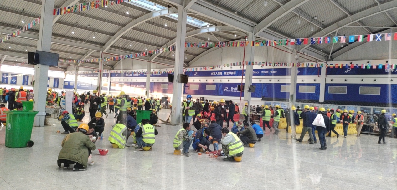 中午就餐時,提醒大家“分開就餐,對疫情時刻保持警惕”的廣播聲不絕于耳。偌大的空地上,不少工人都謹慎地與同事們分開適當距離,蹲在地上開始快速用餐。同樣也包括楊杰,“吃飯要保持距離。我們快點吃完,就能快點回去繼續(xù)干?!?/p>