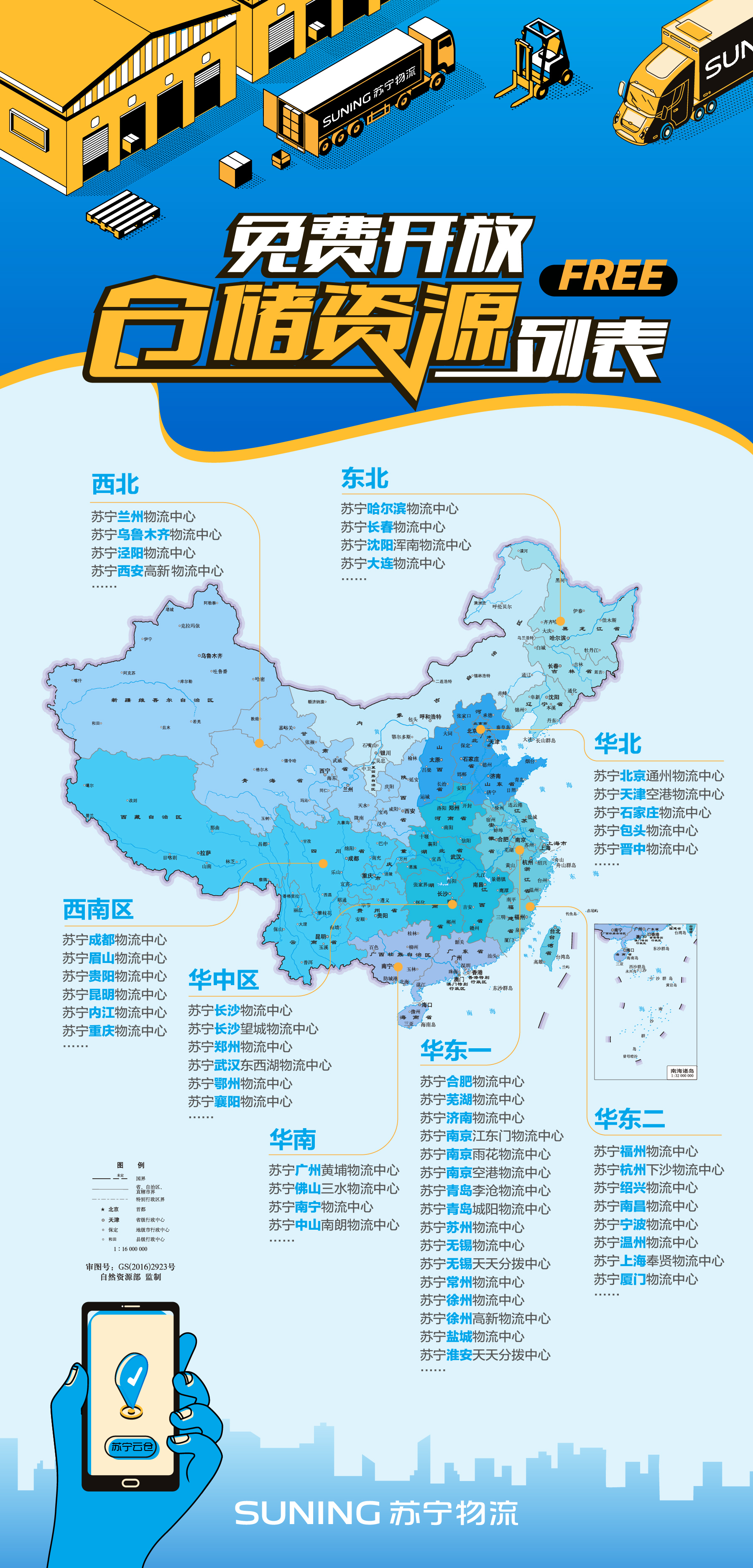 本次免費倉儲資源涉及蘇寧物流全國100+物流中心,涵蓋北京、上海、廣州、南京、成都、武漢、沈陽、西安、天津、溫州、長沙、中山、佛山、徐州、青島、哈爾濱等城市,可滿足全國絕大多數(shù)地區(qū)的相關需求。