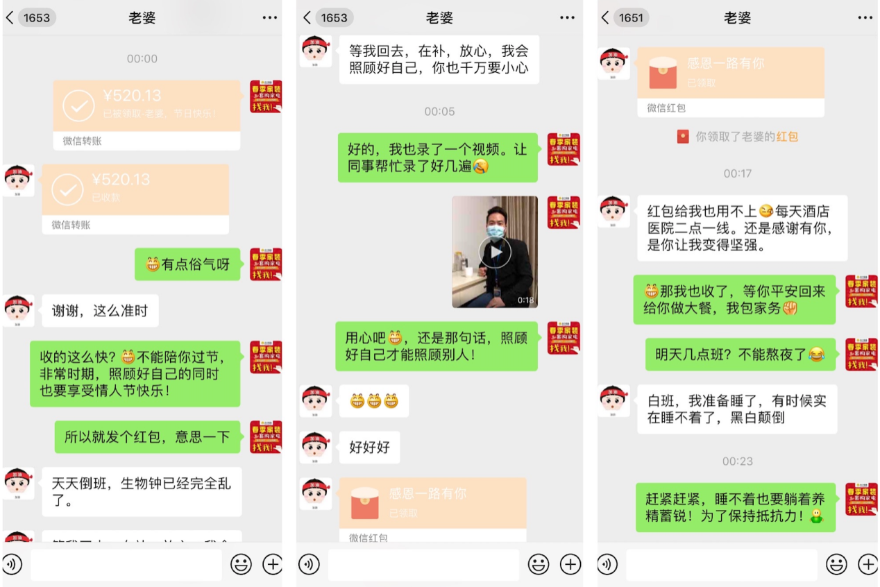 妻子也回贈了紅包,說:“感謝有你,是你讓我變得堅強(qiáng)。”盡管疫情讓他們相隔千里,但愛情始終連接著彼此的心。