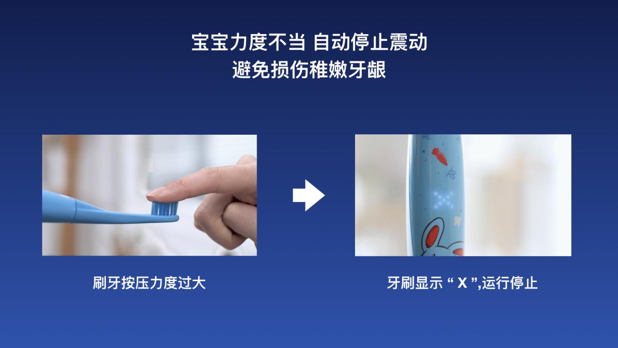 S7000K智能音樂(lè)兒童電動(dòng)牙刷還支持自動(dòng)過(guò)壓降頻保護(hù),當(dāng)孩子在刷牙力度過(guò)大時(shí),該功能就會(huì)啟動(dòng),自動(dòng)停止振動(dòng),屏幕LED還會(huì)顯示出X型警告,保護(hù)孩子稚嫩的牙齦及牙釉質(zhì)。