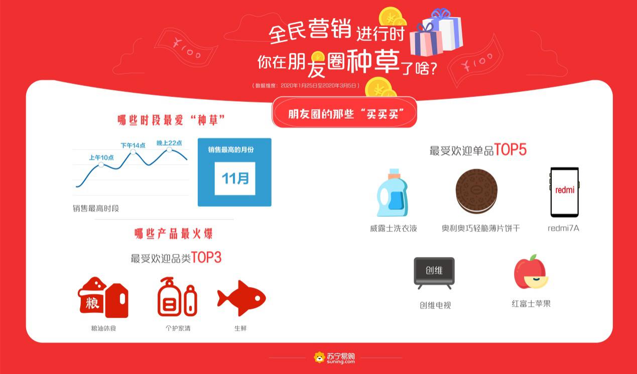 深圳新聞網(wǎng)2020年3月10日訊 線上買菜、線上看病、直播上課、遠程健身……“宅經(jīng)濟”爆發(fā),使得社群私域流量積累的能量進一步凸顯,全民營銷成為新風口。近日,蘇寧易購發(fā)布全民營銷大數(shù)據(jù),2020年1月25日至3月5日,蘇寧推客買家數(shù)和賣家數(shù)分別突破千萬、百萬大關(guān),80后成為朋友圈買、賣“雙主力”,糧油休食、個護家清、生鮮等產(chǎn)品成為最受歡迎的消費品類。