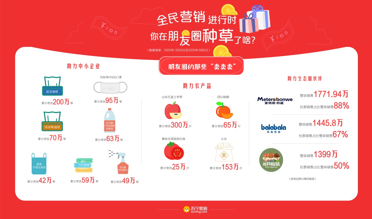 為有效解決農(nóng)產(chǎn)品銷售問題,也同步解決居民的“菜籃子”“果盤子”“米袋子”,蘇寧利用社群營銷幫助農(nóng)民賣出超千萬斤農(nóng)產(chǎn)品。據(jù)蘇寧大數(shù)據(jù)顯示,蘇寧推客累計帶貨山東紅富士蘋果300萬斤、四川柑橘65萬斤、攀枝花滯銷西紅柿25萬斤、大米153萬斤等,成功搭建了農(nóng)產(chǎn)品流通的橋梁,促進了農(nóng)產(chǎn)品上行,為戰(zhàn)“疫”勝利奠定了堅實基礎(chǔ)。