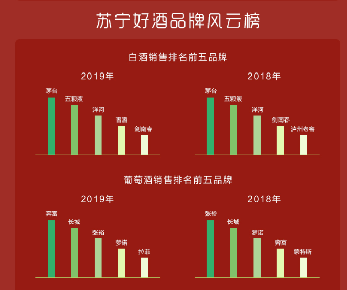對(duì)比2018年各品牌在蘇寧的銷售表現(xiàn),則是穩(wěn)坐釣魚臺(tái)的品牌有之,長(zhǎng)江后浪推前浪的品牌有之。具體來(lái)說,茅臺(tái)、五糧液、洋河一直牢牢占據(jù)白酒品類銷售榜前三。在紅酒方面,奔富后來(lái)者居上,從2018年的第四位躍居第一位。啤酒方面,雪花、哈爾濱、青島、百威、福佳的排名無(wú)變動(dòng),而洋酒方面,馬爹利一直穩(wěn)坐第一。古越龍山也一直是黃酒品牌銷售top1。