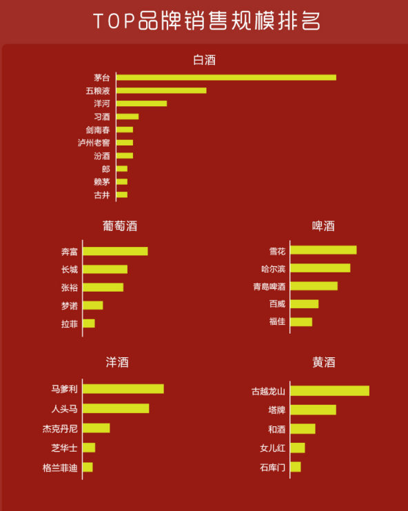 具體來(lái)說,從蘇寧超市公布的品牌銷售規(guī)模排行榜來(lái)看,茅臺(tái)、五糧液、洋河、習(xí)酒、劍南春、瀘州老窖、汾酒、郎酒、賴茅、古井成為當(dāng)之無(wú)愧的白酒品類銷售top10品牌。奔富、長(zhǎng)城、張?jiān)?、?mèng)諾、拉菲則成功問鼎葡萄酒銷售top5,雪花、哈爾濱、青島、百威、福佳在啤酒品類中銷售表現(xiàn)最好。馬爹利、古越龍山則分別成為洋酒、黃酒品類銷售冠軍。