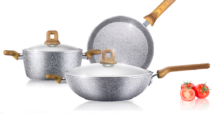 滿(mǎn)足炒、煎、燉多種需求,一套高品質(zhì)、高顏值的鍋具相信你一定不會(huì)拒絕。三禾鍋具三件套 T606是膳石犀利花崗巖健康不粘鍋,采用花崗巖納米起點(diǎn),不粘更持久,耐磨性更高,堪稱(chēng)品質(zhì)首選。除此之外,其還擁有五層技術(shù)工藝,并采用一體成型設(shè)計(jì),質(zhì)量顏值雙升級(jí)。原木紋手柄,防霉防燙;鋼化玻璃蓋,密封防溢;節(jié)能復(fù)合底受熱均勻。三件套內(nèi)包含炒鍋、煎鍋、燉鍋。