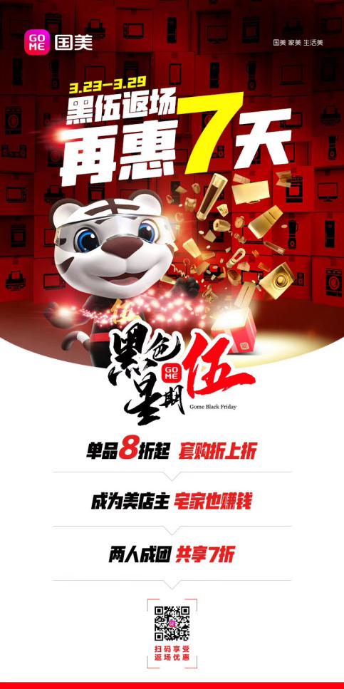 據(jù)了解,3月23日-3月29日,國(guó)美零售“黑伍”返場(chǎng),再惠7天。在此期間,國(guó)美多種優(yōu)惠玩法悉數(shù)上線。用戶(hù)將不僅享受單品8折起、套購(gòu)折上折的優(yōu)惠,成為美店主,還能宅家賺錢(qián),享受商品返利。此外,還有兩人成團(tuán),共享7折等,快來(lái)國(guó)美美店廚飲專(zhuān)場(chǎng)選購(gòu)吧。