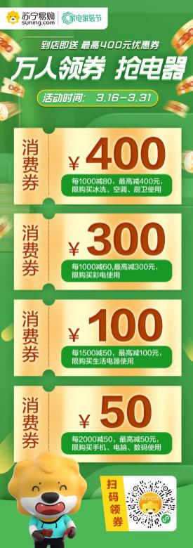 深圳蘇寧針對整個粵東區(qū)域投放近20萬張消費券,該券根據(jù)可用產(chǎn)品類型分為400元、300元、100元、50元四種不同面值。消費券以電子券為形式發(fā)放,消費者可通過深圳蘇寧微信公眾號、深圳蘇寧官方微博、蘇寧云店小程序和蘇寧易購門店進行領取,領取成功后,消費券將自動存儲在消費者的蘇寧會員賬戶中,使用時系統(tǒng)會根據(jù)購買的商品類別進行自動適配和抵扣結算。