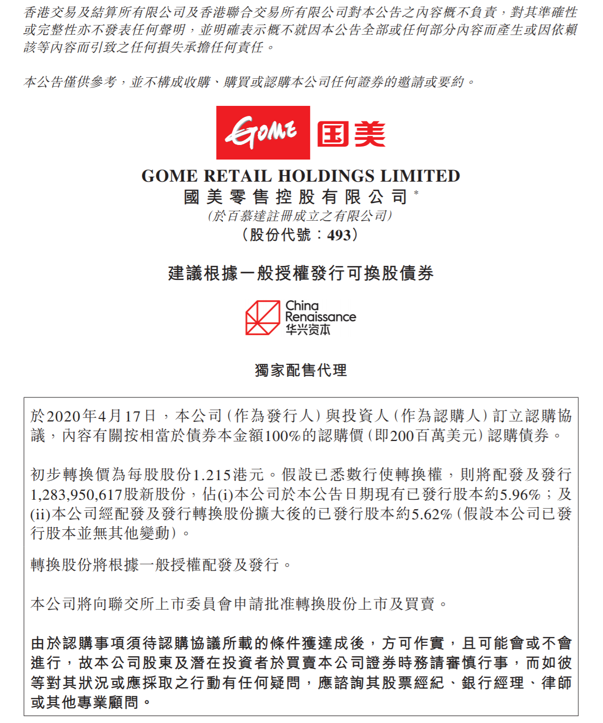 公告稱,拼多多以總計(jì)2億美金的可轉(zhuǎn)換債券方式對(duì)國(guó)美進(jìn)行戰(zhàn)略投資。根據(jù)協(xié)議,初步股份轉(zhuǎn)換價(jià)為每股1.215港元,分別較國(guó)美零售2020年4月17日收盤價(jià)及截至2020年4月16日前五個(gè)連續(xù)交易日之平均收盤價(jià)溢價(jià)66.44%及68.75%。
