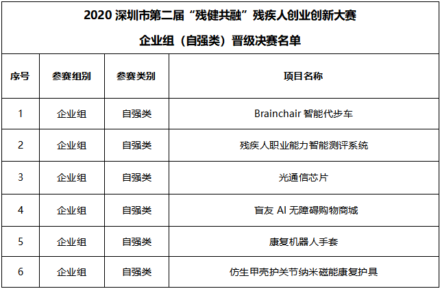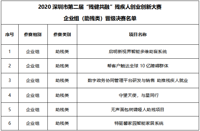 2020深圳市第二屆“殘健共融”殘疾人創(chuàng)業(yè)創(chuàng)新大賽企業(yè)組(助殘類)晉級(jí)決賽名單
