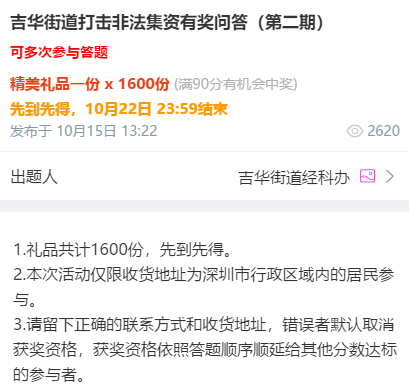 此外,為加強宣傳效果,提升居民對非法集資知識的知曉率,提高居民參與打擊非法集資的熱情,吉華街道經科辦還開展了打擊非法集資知識有獎問答活動和轉發(fā)打擊非法集資宣傳推文朋友圈打卡活動,以這種富有趣味性、知識性的活動形式,切實普及打擊非法集資相關知識,提高居民自我保護能力?;顒庸灿?000余民轄區(qū)居民參與,派發(fā)禮品2000份。