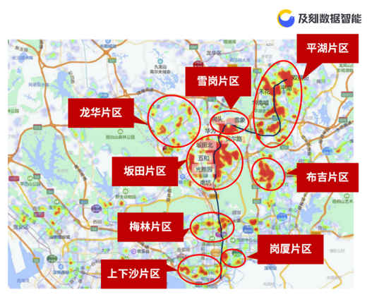 從熱力圖中可以看出,10號線客流集中居住在三大片區(qū):平湖、雪崗、坂田,深圳地鐵10號線的開通,結束了三大片區(qū)內多數(shù)區(qū)域不通地鐵的歷史,這三個大片區(qū)的居民成為了10號線的主力乘客。