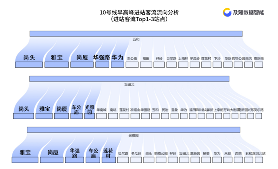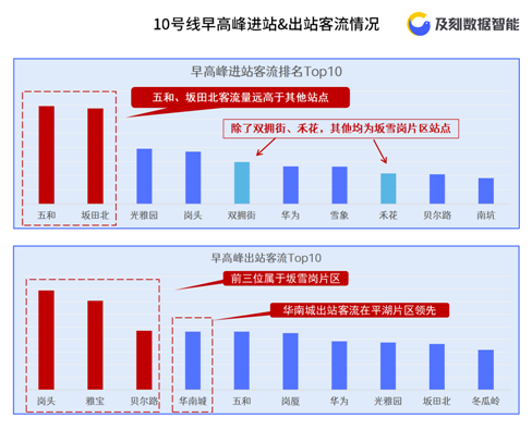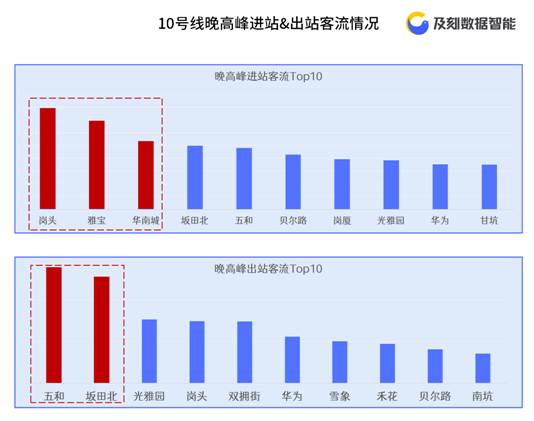 早高峰(6-10點)進站客流Top10站點中,坂雪崗片區(qū)占據(jù)8席,反映其周邊區(qū)域聚居著眾多的上班族。其中,五和、坂田北進站客流遙遙領先其他站點。