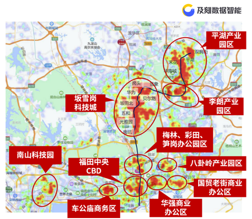從熱力圖中可以看出,10號線乘客工作地主要集中在關外的三大片區(qū),分別是坂雪崗科技城、平湖產(chǎn)業(yè)園區(qū)、李朗產(chǎn)業(yè)園區(qū)。