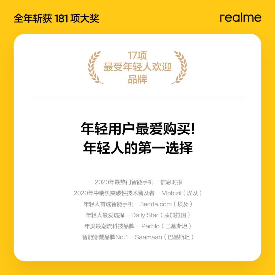 自創(chuàng)立以來,realme一直面向年輕用戶群體,基于對年輕人審美與偏好的精準(zhǔn)洞察與理解,不斷滿足和超越年輕科技愛好者的需求,這一策略在東南亞、南亞、歐洲、非洲等市場獲得極大認(rèn)可。2020年,全球給予realme“年輕人最喜愛品牌”等相關(guān)獎項達(dá)17項,用實力證明realme是“年輕人第一選擇”。同時,realme一舉網(wǎng)羅全球各大產(chǎn)品獎項,充分證實了“好產(chǎn)品會說話,產(chǎn)品才是硬實力”這句被商界奉為圭臬的卓見。
