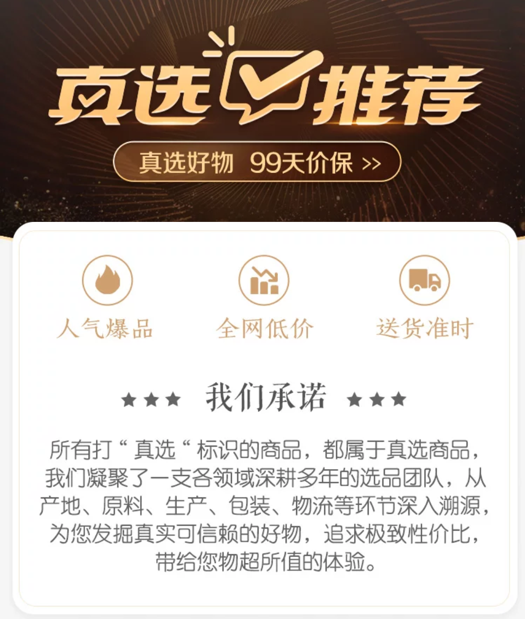 “真快樂(lè)”從誕生初始就承擔(dān)著這份重任,并且依托價(jià)美物好的“真選”策略,贏得消費(fèi)者的心。把“真快樂(lè)”這三個(gè)簡(jiǎn)單的字拆分解讀,“真”指的是嚴(yán)選商家、真選商品;“快”指的是快送、準(zhǔn)時(shí)達(dá);“樂(lè)”則是商家和消費(fèi)者能夠娛樂(lè)賣、娛樂(lè)買、分享樂(lè),這是“真快樂(lè)”的三大內(nèi)涵,也是提升消費(fèi)者購(gòu)物體驗(yàn),提升忠誠(chéng)度和復(fù)購(gòu)粘性的3大關(guān)鍵。