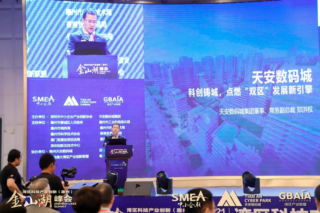 天安數(shù)碼城集團(tuán)董事、常務(wù)副總裁鄭洪權(quán)以天安數(shù)碼城為引,引出了《天安數(shù)碼城——打造粵港澳大灣區(qū)科技創(chuàng)新引擎》的主題演講,在演講中他說(shuō)“三十載,天安數(shù)碼城在經(jīng)濟(jì)大潮中始終保持旺盛的生命力,專注于企業(yè)服務(wù)精神和與時(shí)俱進(jìn)的創(chuàng)新思維功不可沒,堅(jiān)持以客戶為導(dǎo)向,以園區(qū)企業(yè)為中心,這也是天安數(shù)碼城保持的初心。對(duì)于惠州天安數(shù)碼城,我們是敢為民先,率先破局?;葜萏彀矓?shù)碼城目標(biāo)是科創(chuàng)產(chǎn)業(yè)的新地標(biāo),在雙區(qū)建設(shè)深度融灣的大背景下,惠州作為粵港澳大灣區(qū)重要節(jié)點(diǎn)城市具有無(wú)可比擬的區(qū)域優(yōu)勢(shì)和強(qiáng)勁的后發(fā)動(dòng)力,在深圳都市圈發(fā)揮著重要作用?;葜萏彀矓?shù)碼城作為集團(tuán)在全國(guó)范圍內(nèi)布局的第14座城市、23座園區(qū),被認(rèn)為是廣東省的重大項(xiàng)目,作為惠州產(chǎn)業(yè)的先行區(qū),我們將在金山湖畔主動(dòng)搶抓雙區(qū)建設(shè)的重大歷史機(jī)遇,緊密結(jié)合區(qū)位、交通、景觀四大要素優(yōu)勢(shì),努力打造科學(xué)、科技、科普、科創(chuàng)、科研、科教為主題的科創(chuàng)公園,真正建設(shè)為粵港澳大灣區(qū)產(chǎn)成人融合的高度結(jié)合新地標(biāo)?!?/p>