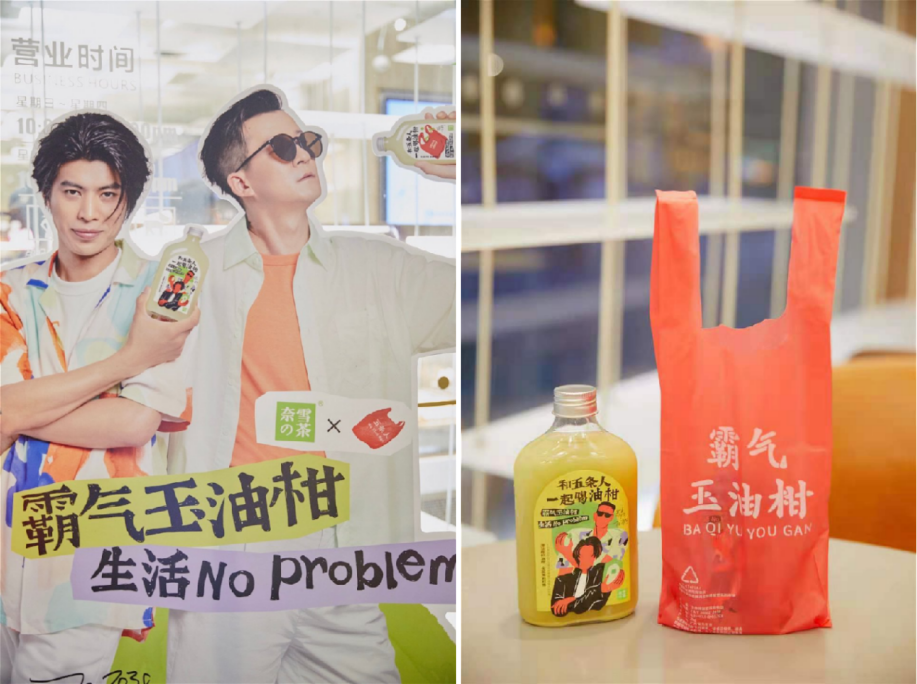 對(duì)于品牌×明星的聯(lián)名來(lái)說(shuō),調(diào)性契合是聯(lián)名活動(dòng)不可或缺的"出圈基因"。而奈雪的茶霸氣玉油柑與樂(lè)隊(duì)五條人,看似來(lái)自不同次元,實(shí)則都有大膽、堅(jiān)持、向上、樂(lè)觀的底色,而非將不搭嘎的兩個(gè)品牌生硬地“拉郎配”。奈雪還圍繞聯(lián)名別出心裁地推出了五條人主題的立牌、貼紙和堆頭,甚至將五條人標(biāo)志性的“紅色塑料袋”做成了極具個(gè)性且生物可降解的奈雪打包袋,可謂細(xì)節(jié)之處見真章。