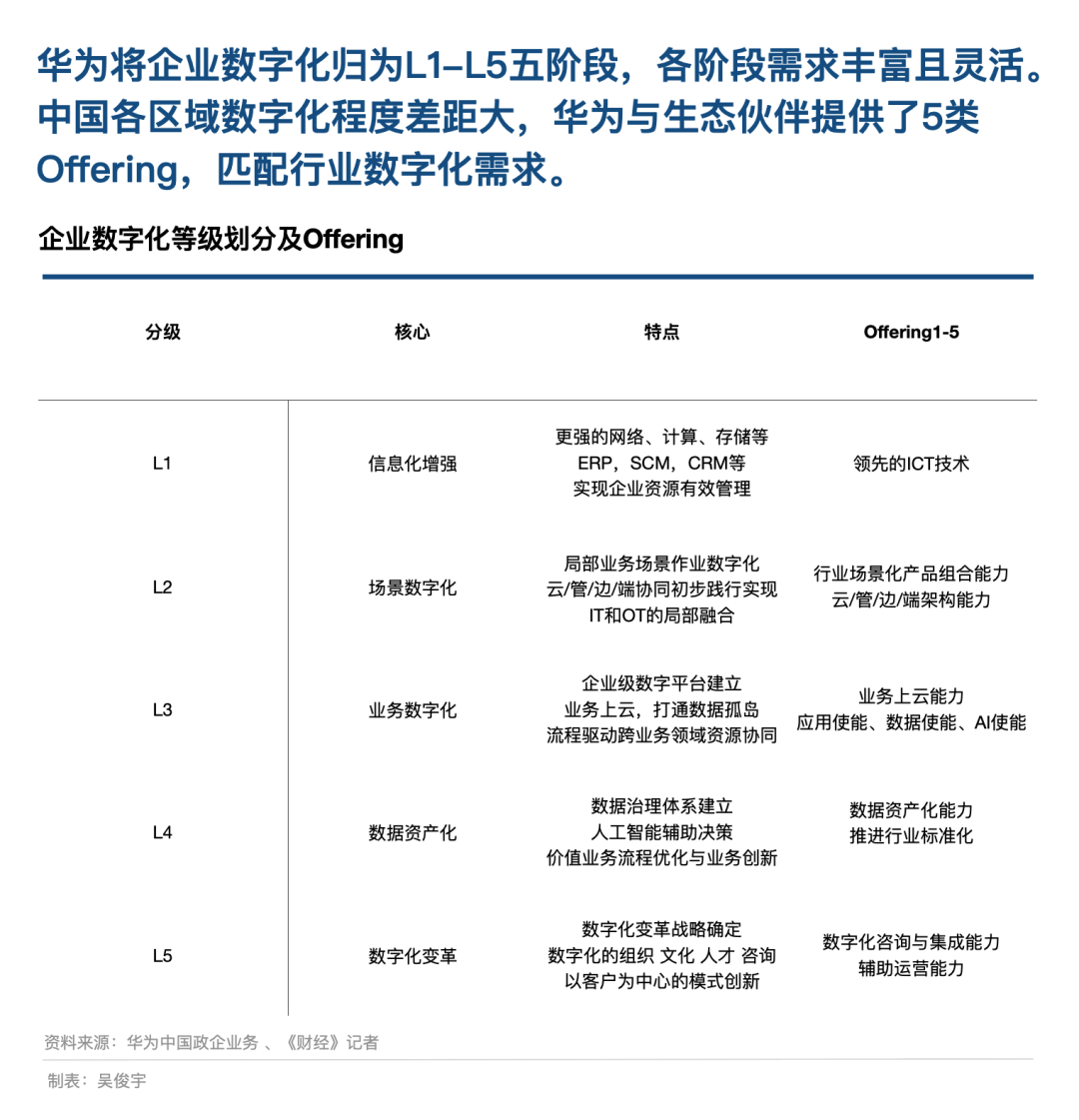 應(yīng)對(duì)每個(gè)階段的數(shù)字化挑戰(zhàn),需要提供可靈活搭配的能力,其中可能涉及ICT技術(shù)這類L1級(jí)能力,也可能涉及數(shù)字化咨詢、集成、輔助運(yùn)營這類L5級(jí)能力。為此,華為攜手伙伴提供了5類Offering。