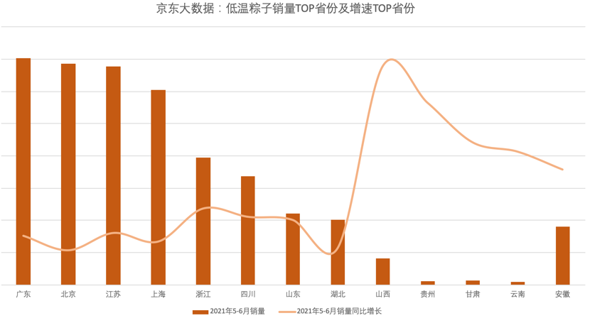 與低溫發(fā)展趨同的,還有平臺助力食品企業(yè)數(shù)字化和渠道完善帶來的整個行業(yè)對下沉市場的發(fā)掘——從銷量看北京、廣東及江浙滬等發(fā)達(dá)地區(qū)是低溫粽子的主要消費區(qū)域,四川、山東、湖北等省緊隨其后。而隨著京東冷鏈和物流的下沉和完善,山西、貴州、甘肅、云南、安徽等省區(qū)的增速位列全國前五。