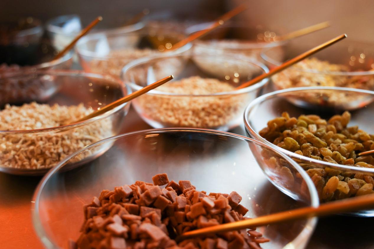 除了產(chǎn)品口味、形式上的革新,探魚的lab店還新增了“DIY”專區(qū)。茶水、水果、涼菜、冰粉都可以在DIY區(qū)根據(jù)自己的口味隨意搭配,增加了消費(fèi)者在用餐過程中的可玩性。值得一提的是,探魚的DIY冰粉取消了目前市場(chǎng)中常見的或固定或多樣的搭配方式,為消費(fèi)者提供了3種冰粉基底,18種各色配料,搭配方式和用量全部由消費(fèi)者自己選擇。不同口味質(zhì)地的配料為消費(fèi)者提供了至少17000+種配比方式,這樣的設(shè)置潛在性地增加了用餐的社交功能,在整個(gè)就餐過程中,消費(fèi)者被擁有了“體驗(yàn)者”與“傳播者”的功能性身份,擁有了一場(chǎng)“就餐+游戲”的個(gè)性體驗(yàn)。
