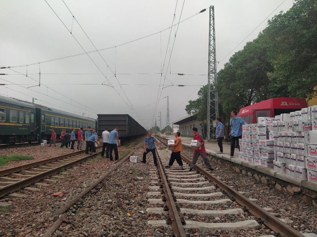 在第二批物資車隊駛出倉庫的同時,第三批滿載540多箱食品和礦泉水的京東物流車涉水抵達(dá)K226/7次列車臨時??康泥嵵蓁F爐站,為仍在滯留的數(shù)百名旅客送去應(yīng)急物資。