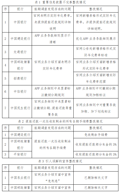 中國銀行、交通銀行、中國郵政儲蓄銀行、招商銀行等銀行完善了官網(wǎng)信用卡分期業(yè)務(wù)實際年化費率的披露; 中國銀行、中國建設(shè)銀行、中信銀行、中國民生銀行等銀行完善了撤銷分期、提前還款規(guī)則等重要信息的披露;中國建設(shè)銀行、中國郵政儲蓄銀行、平安銀行針對消費者提前還款,由原先一次性須收取剩余所有各期手續(xù)費,修改為免收剩余手續(xù)費或僅收取一定比例違約金;中國農(nóng)業(yè)銀行、中國郵政儲蓄銀行、中國民生銀行刪除了“免利息”“手續(xù)費比例不隨分期期數(shù)的增長而提高”等容易引起消費者誤解的宣傳語。各銀行存在問題及整改情況如下: