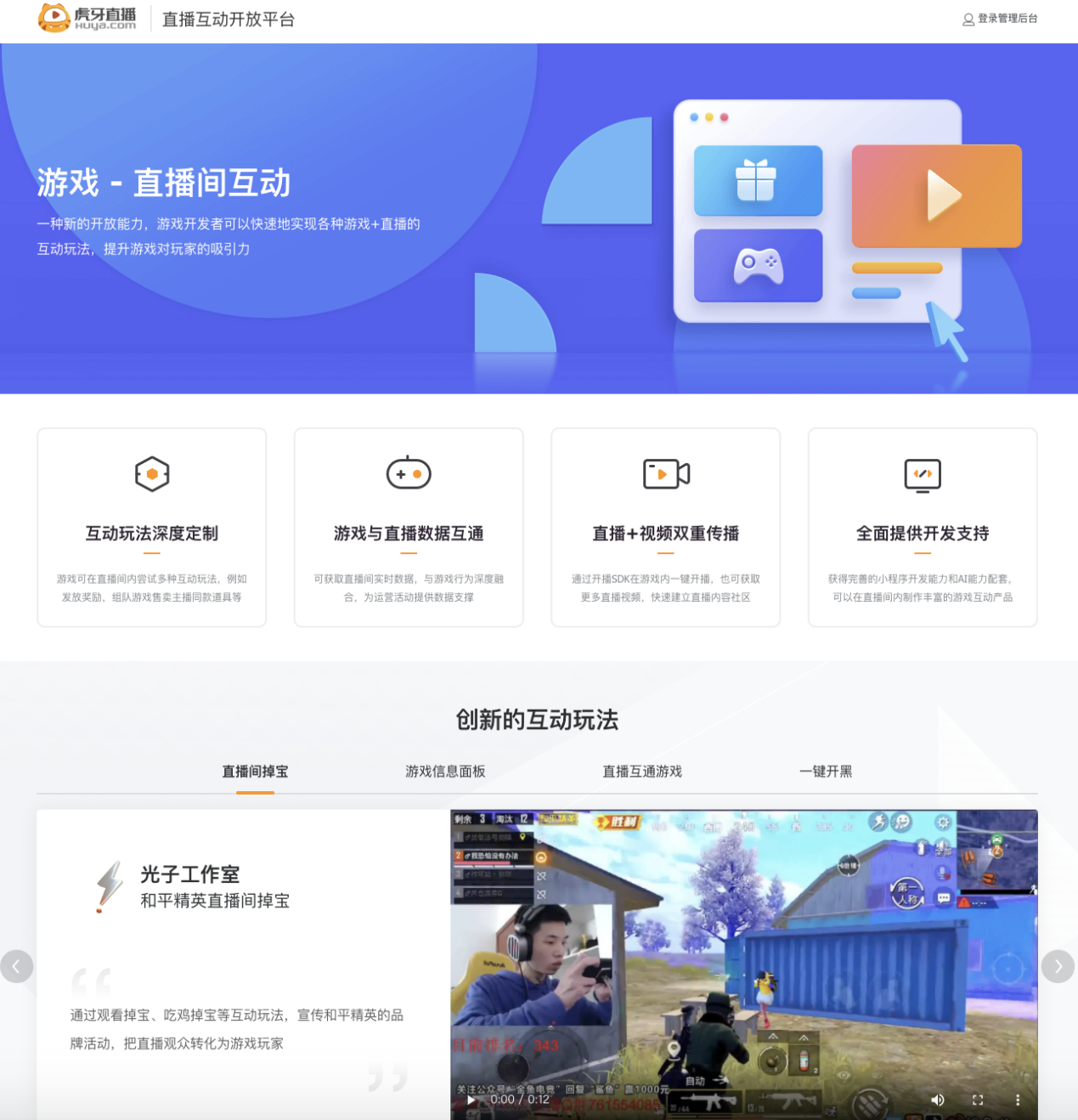今年3月,虎牙直播互動開放平臺正式上線。通過開放平臺提供的七大核心開放能力,游戲廠商可以獲得完善的小程序開發(fā)能力和AI能力配套,快速實(shí)現(xiàn)各種“游戲+直播”的互動玩法。
