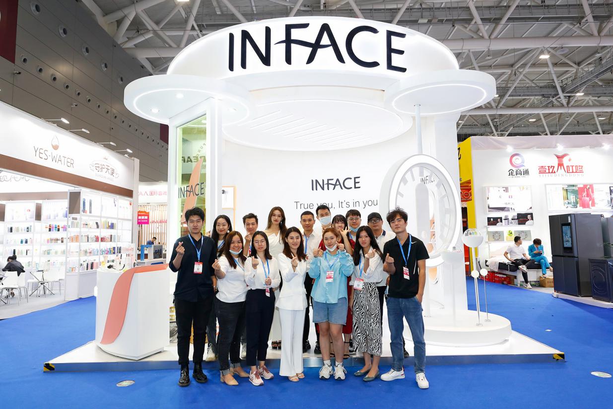 據了解,本次inFace展位的主題是“未來科技之美”,在視覺的核心位置有一個融合產品造型被稱為“時光之輪”的櫥窗式展區(qū)。從展會現場可以看出,2.0版本的inFace品牌形象包括了全新的Logo、配色和Slogan,加上現場的皮膚檢測、新品體驗、趣味互動和和美女BA(美容顧問)等,在新顏值和技能包Buff加持下的inFace展位脫穎而出,很快就吸引了大量觀眾簽到打卡、商談品鑒。