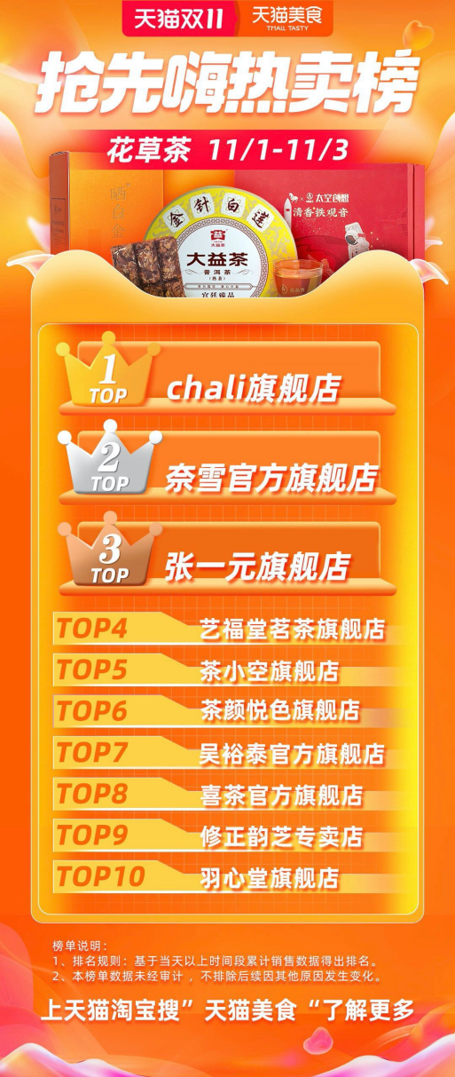 今年“雙11”電商購(gòu)物節(jié)比往年更早開(kāi)啟,10月20日晚8點(diǎn)便拉開(kāi)序幕,奈雪的茶隨之推出滿(mǎn)減、秒殺等多項(xiàng)優(yōu)惠活動(dòng)。奈雪此次雙11迎來(lái)開(kāi)門(mén)紅,數(shù)據(jù)顯示,11月1日凌晨開(kāi)售后僅10分鐘,奈雪的茶的銷(xiāo)售總額便突破去年全天。11月1日-3日,伴隨著茶禮盒等產(chǎn)品的熱銷(xiāo),奈雪躋身花草茶銷(xiāo)售額排行榜TOP2。
